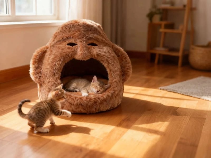 The monkey-shaped cat house presents a pet shelter designed as an oversized sculptural form, featuring a large monkey head with an open-mouth entrance. The structure uses a plush exterior with soft padding, forming a rounded enclosure that functions as a resting space for cats. The interior is recessed within the head, creating a cave-like volume sized for small animals. The exaggerated facial features define the outer shell, while the entry opening is integrated directly into the mouth.