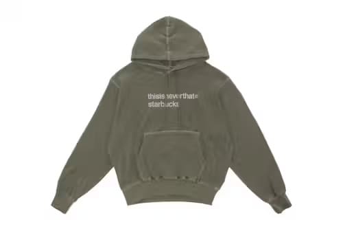 The thisisneverthat x Starbucks neverthatcoffee joint collection introduces a lifestyle capsule that combines café culture with streetwear across apparel and accessories. The range includes graphic T-shirts, hoodies, caps, and tote bags alongside drinkware such as mugs, tumblers, and reusable cups. Designs use thisisneverthat’s restrained branding paired with Starbucks’ visual elements, applied through minimal graphics, small logos, and neutral color palettes across each item.