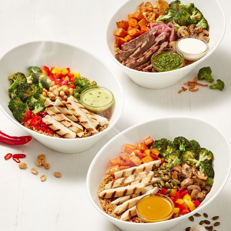 Each of the three Warm Bowls starts with seasoned brown basmati rice and then adds warm roasted veggies and proteins. Finally, flavorful sauces bring everything together. Options range from the Lotus Bowl topped with a Thai green coconut curry sauce, the Bistro Bowl made with sirloin steak, and the Autumn Bowl featuring grilled chicken.