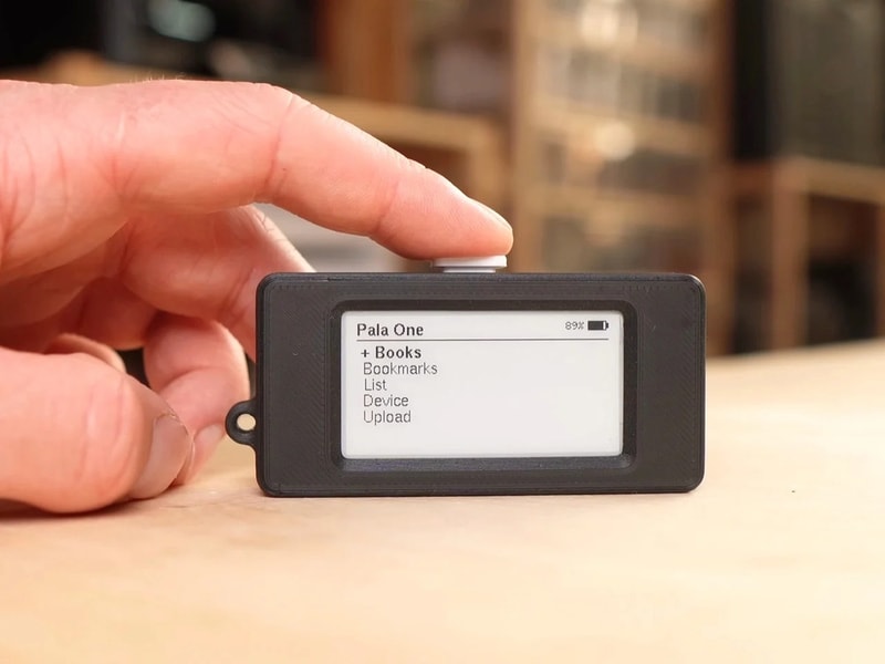 Pala One mini e-reader by Paul Lagier is a compact device designed to function as a fully standalone reading tool within a form factor comparable to an AirPods case. The unit is built around an ESP32 microcontroller and a small e-ink display, housed inside a 3D-printed enclosure that clips onto a keychain. Interaction is reduced to a single physical button, creating a simplified interface that cycles through pages and menus without touch input or additional controls.