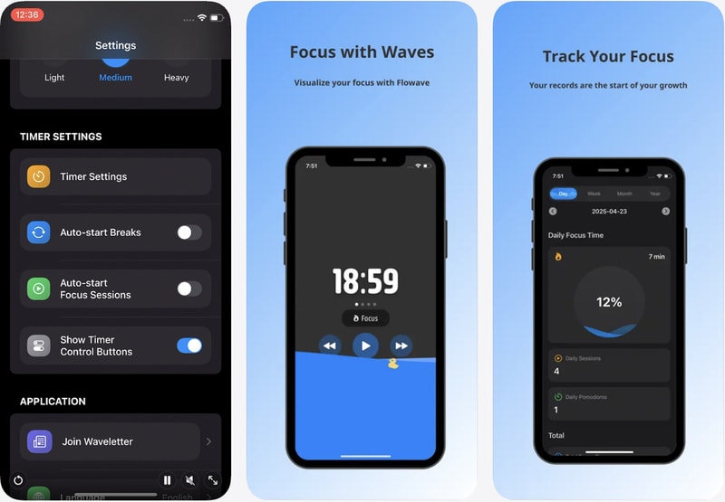 Flowave Pomodoro Timer & Sound is a productivity tool based on the Pomodoro technique, designed to help users manage focused work sessions and structured breaks. It combines time tracking with visual wave animations and ambient audio to create a more immersive and calming workflow experience.