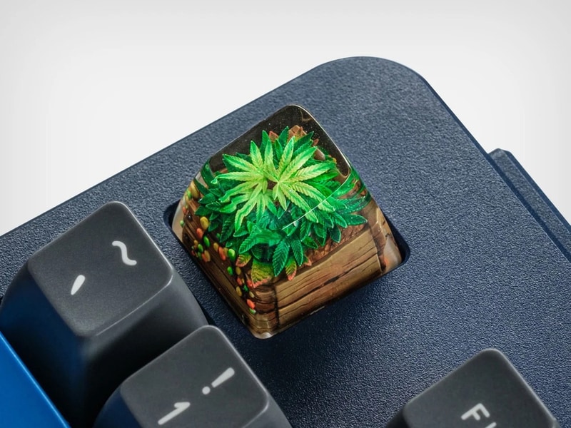 Rasta Jardin keycaps by Dwarf Factory are handcrafted keyboard caps that embed detailed plant compositions within transparent resin domes. The Rasta Jardin keycaps are built from individually assembled miniature elements, including serrated leaves, woven baskets, soil layers, and small stones, all arranged at a highly reduced scale before being sealed in resin. Each unit is hand-painted, resulting in slight variations in color, structure, and composition across pieces. Designed in an SA profile and standing approximately 16mm tall, the caps are compatible with Cherry MX switches and typically placed on accent keys such as Escape or the function row.
