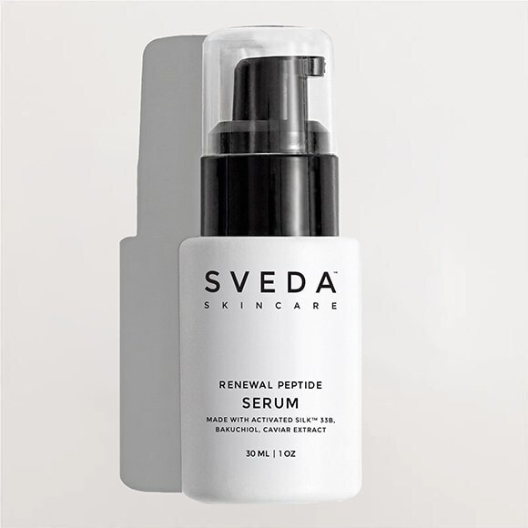 SVEDA®'s Renewal Peptide Serum is a luxury skincare product formulated with Activated Silk® 33B-α, caviar extract, bakuchiol, hydrolyzed pearl, green tea hydrosol, tsubaki seed oil, white rose distillate, and grass-fed beef tallow. The brand maintains that all of these ingredients are entirely natural or naturally derived.
