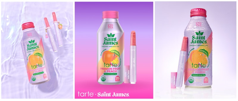 tarte Cosmetics and Saint James Iced Tea launched a limited-edition co-branded collaboration featuring tarte's 'Maracuja Juicy Lip' gloss alongside a passionfruit and peach organic green tea. The tarte Saint James collaboration dropped exclusively on Amazon, TikTok Shop and both brands' websites on April 6.