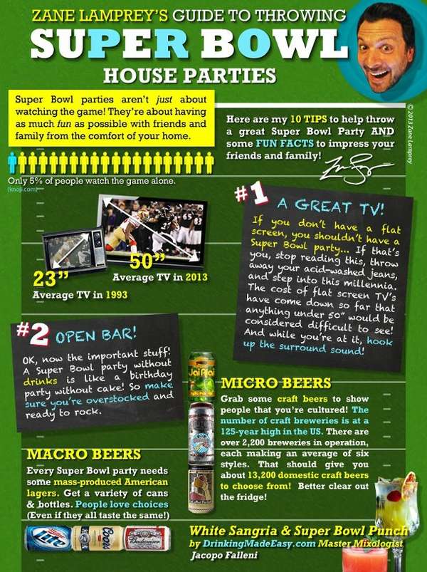 This hilarious infographic by the notorious Zane Lamprey dishes out some very useful Superbowl party tips.