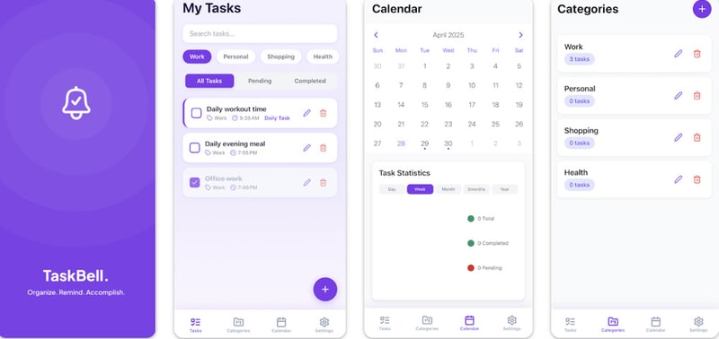 TaskBell is a task management and reminder application designed to support personal productivity and daily organization. It allows users to create categorized task lists across areas such as work, personal responsibilities, health, and shopping.