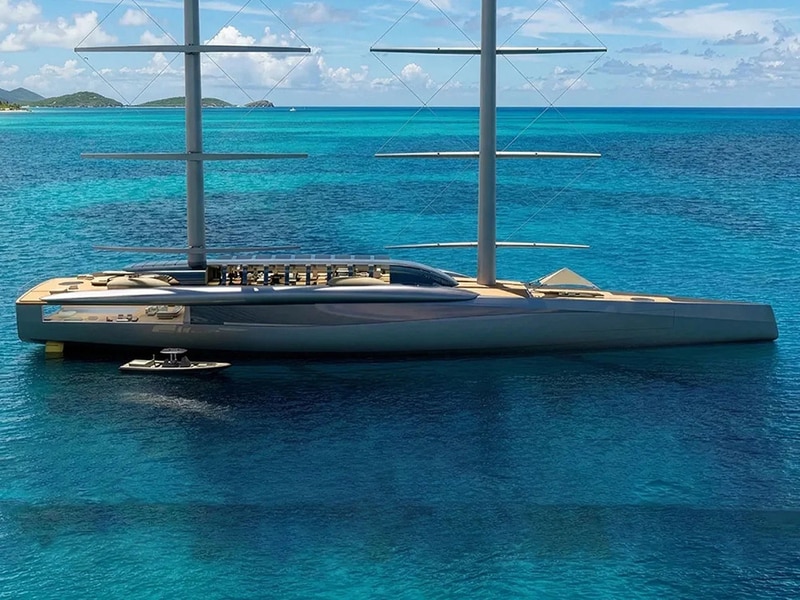 The yacht features a twin-mast DynaRig system with rotating sails that deploy electronically, paired with energy systems that support onboard efficiency. A glass-wrapped superstructure defines the upper levels, creating open sightlines across shared spaces such as the navigation area, wellness zones, and lounges. Below deck, the design includes guest cabins, a dive room, and storage for tenders, completing a layout focused on scale, flow, and interior continuity.