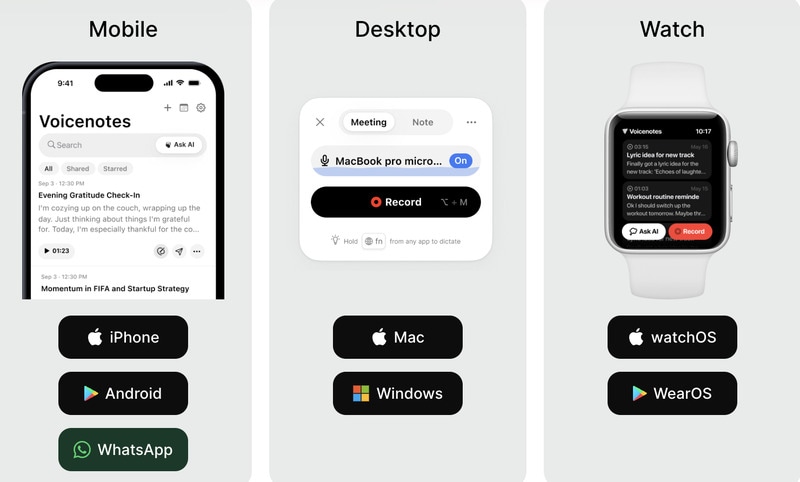 Voicenotes is a digital note-taking application that transcribes speech and converts them into structured, searchable text using advanced AI transcription. Users can record ideas, meetings, or reflections in natural speech, which the platform processes into written notes with high accuracy.