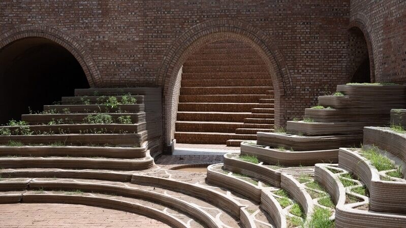 Walls and vaults are produced on-site using additive manufacturing techniques that layer bespoke masonry components, reducing material waste and enabling complex, curving geometries without conventional formwork. Interior volumes are organised around a sequence of vaulted chambers that open onto landscaped courtyards and light wells, connecting subterranean spaces with exterior terrain.