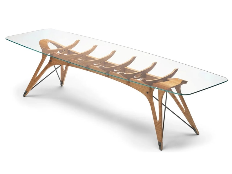 The Carlo Mollino Vertebra table has entered production for the first time, bringing a 1950 design beyond its original limited prototypes. The piece pairs a clear glass surface with a sculpted wooden base made from interlocking, curved plywood elements that mirror the structure of a spine. Each component is shaped and assembled to create a continuous, flowing support system that appears both delicate and structurally precise.