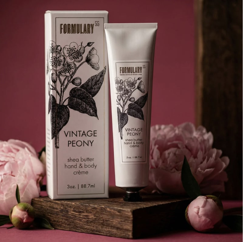 Formulary 55's Vintage Peony includes a Nourish Body Oil, a Shea Butter Soap, an On-the-Go Shea Butter Hand and Body Crème, and a Glow Candle, all formulated without phthalates, parabens, SLS, or dyes and made entirely with vegan ingredients. The body oil relies on rosehip oil, vitamin E, and fatty acid-rich hydrators to address dryness and leave skin looking luminous, while the shea butter soap is superfatted to provide lasting moisture and a creamy feel rather than stripping the skin. The hand and body crème, on the other hand, offers five percent shea butter alongside aloe and vitamin E, delivering hydration without greasiness in a portable aluminum tube.